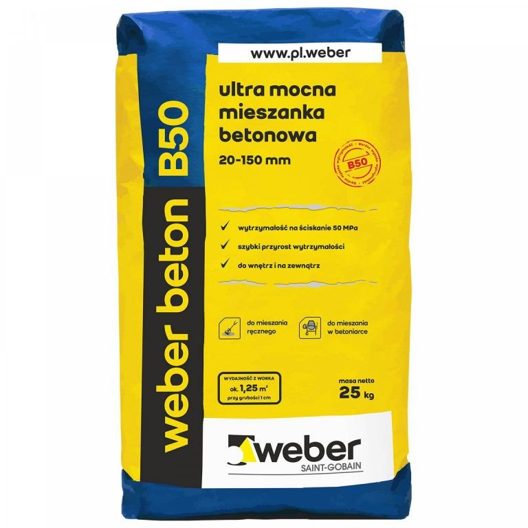 Weber beton B50 to sucha mieszanka cementu, kruszyw oraz dodatków, gotowa do użycia po wymieszaniu z wodą.
