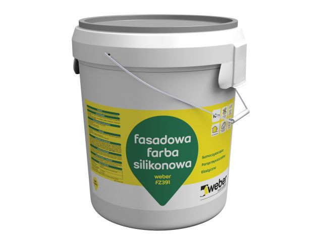 Silikonowa farba elewacyjna weber FZ391 jest fabrycznie barwionym produktem, dostarczanym w wiadrach, gotowym do użycia. Produkt oparty jest o środek wiążący na bazie żywic silikonowych. Użyte w farbie surowce gwarantują gotowej powłoce malarskiej wysoką trwałość oraz długotrwałą ochronę przed zabrudzeniami. Farba posiada powłokowe zabezpieczenie przeciwko porastaniu algami i grzybami.
