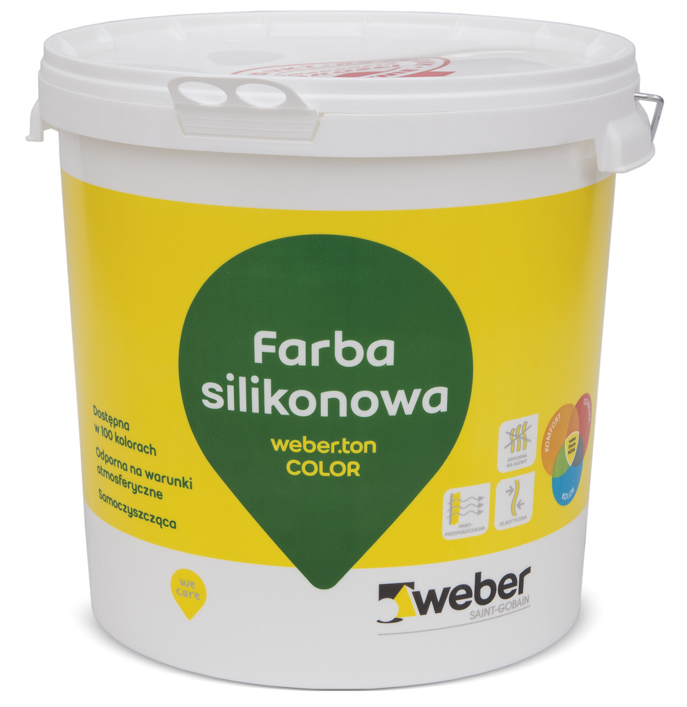 Farba elewacyjna weber.ton color jest fabrycznie barwionym produktem, dostarczanym w wiadrach w formie płynnej, gotowym do użycia na placu budowy po uprzednim przemieszaniu. Produkt oparty jest o żywice silikonowe oraz wysokiej jakości pigmenty. Farba posiada powłokowe zabezpieczenie przeciwko porastaniu algami lub grzybami.