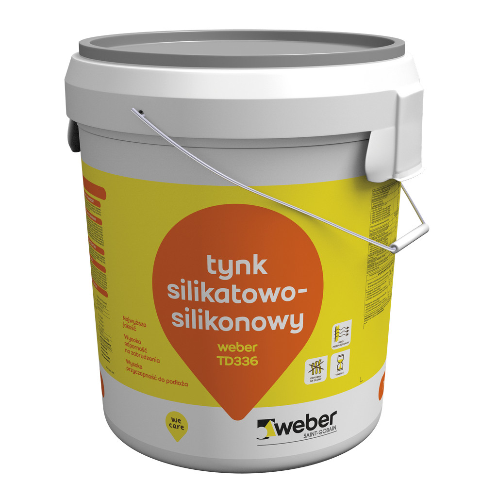 Silikatowo - silikonowa masa tynkarska weber TD336 jest fabrycznie barwionym produktem, dostarczanym w wiadrach, w formie pasty, gotowym do użycia na placu budowy po uprzednim przemieszaniu. Produkt oparty jest o środek wiążący na bazie potasowego szkła wodnego, wzbogaconego żywicą krzemoorganiczną oraz o mineralne kruszywa strukturalne. Użyte w tynku surowce gwarantują gotowej wyprawy tynkarskiej wysoką trwałość oraz długotrwałą ochronę przed zabrudzeniami. Tynk posiada powłokowe zabezpieczenie przeciwko porastaniu algami i grzybami.