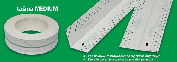 ZASTOSOWANIE TAŚMY MEDIUM:Taśmę MEDIUM stosuje się do łączenia płyt kartonowo-gipsowych w rogach wewnętrznych i na płaskich powierzchniach w miejsce siatki, fizeliny, taśmy papierowej oraz taśmy papierowej z wkładką aluminiową.Taśma wyrównuje, prostuje i usztywnia skomplikowane, trudne do wyprowadzenia rogi wewnętrzne ścian i sufitów o dowolnym kącie rozwarcia.MEDIUM znajduje zastosowanie w miejscach narażonych na wilgoć, gdzie taśma papierowa mogłaby ulec zniszczeniu np. w okolicach wanien i pryszniców.ZALETY TAŚMY MEDIUM:- Niezwykle trwała – nie pęka- Doskonale maskuje pęknięcia płyt- Łatwa i szybka w montażu- Posiada unikalną strukturę tworzącą sztywne i gładkie powierzchnie- Zapewnia proste linie rogów wewnętrznych- Odporna na działanie wody i rdzy (nie pęcherzy się)- Wydajna gdyż pozwala na wykorzystanie 100% materiału- Wielokrotnie mocniejsza niż zwykła taśma papierowa- Pozwala na pokrycie dowolna farbą- Nie wymaga stosowania dodatkowych narzędzi, jak spinacze czy taśmy montujące- Wygodna w użyciu, transporcie i przechowywaniu dzięki nawinięciu na rol