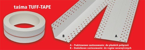 Taśmę TUFF-TAPE stosuje się do łączeń płyt gipsowo-kartonowych na płaskich powierzchniach (takich jak sufit czy ściany) w miejsce siatki, flizeliny, taśmy papierowej, taśmy papierowej z wkładką aluminiową, oraz do wykańczania narożników wewnętrznych.