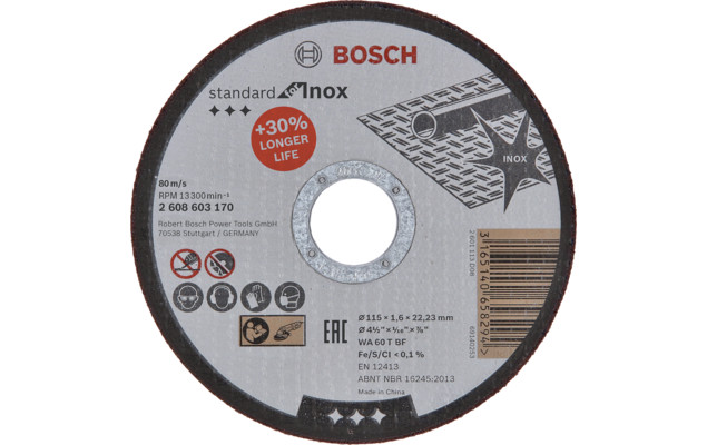 Tarcza tnąca Standard for Inox to niezawodne narzędzie do obróbki stali Inox. Wykonana z tlenku glinu tarcza została specjalnie zaprojektowana do obróbki stali Inox. Nie zawiera żelaznych, siarkowych ani chlorowych wypełniaczy. Tarcza przystosowana do cięcia stali Inox. Pasuje do szlifierek kątowych marki Bosch.