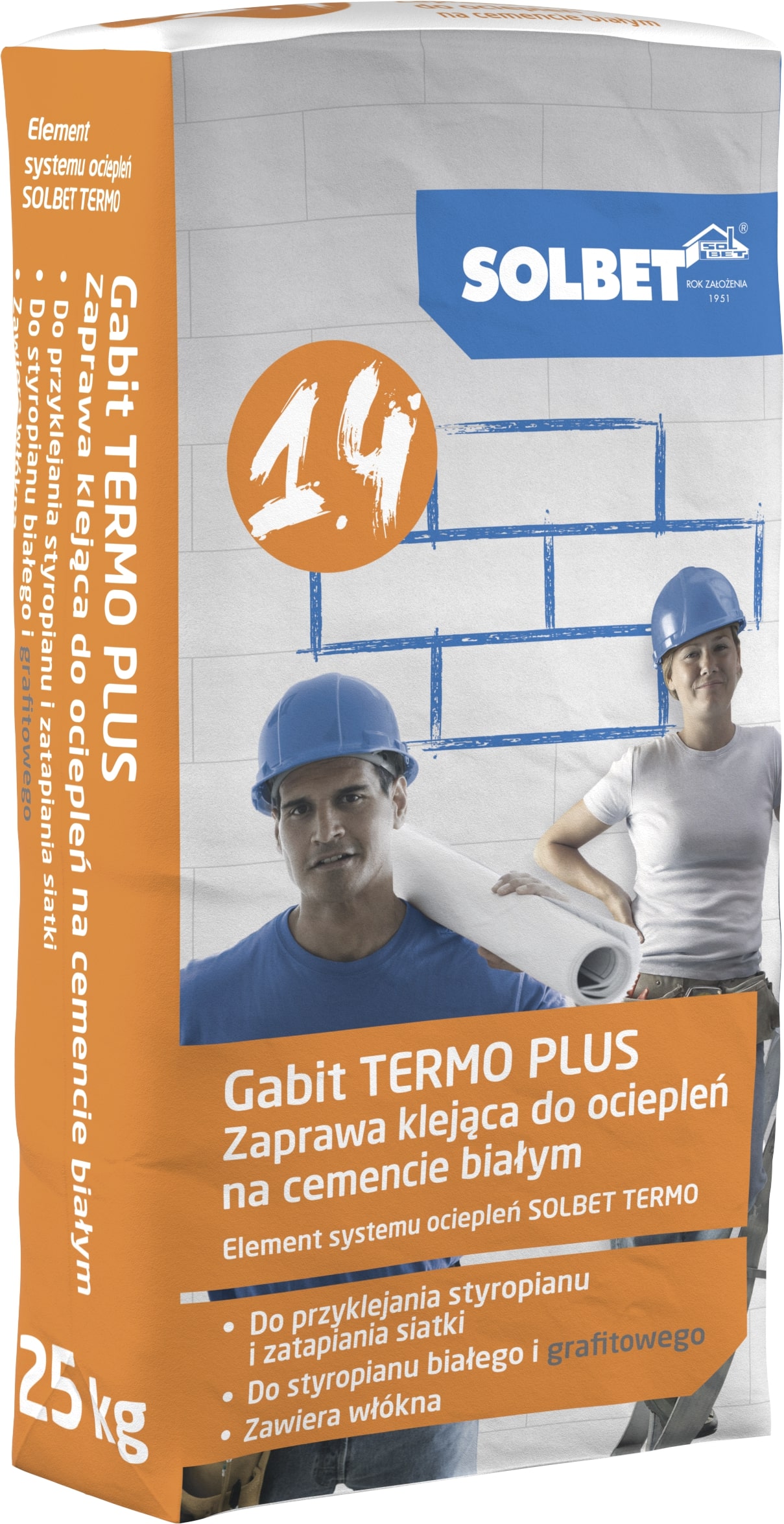 Zaprawa klejąca do ociepleń na cemencie białym Gabit TERMO PLUS 1.4 służy do mocowania płyt styropianowych (EPS) do mineralnych podłoży budowlanych oraz do wykonywania warstwy zbrojonej pod wyprawę tynkarską, w bezspoinowych ociepleniach budynków nowo wznoszonych oraz eksploatowanych. Zaprawa Gabit TERMO PLUS 1.4 może być używana do prac ociepleniowych z wykorzystaniem styropianu grafitowego, pod warunkiem ścisłego przestrzegania zaleceń zawartych w Karcie Technicznej Wyrobu i/lub instrukcji dostępnej na stronie solbet.pl.