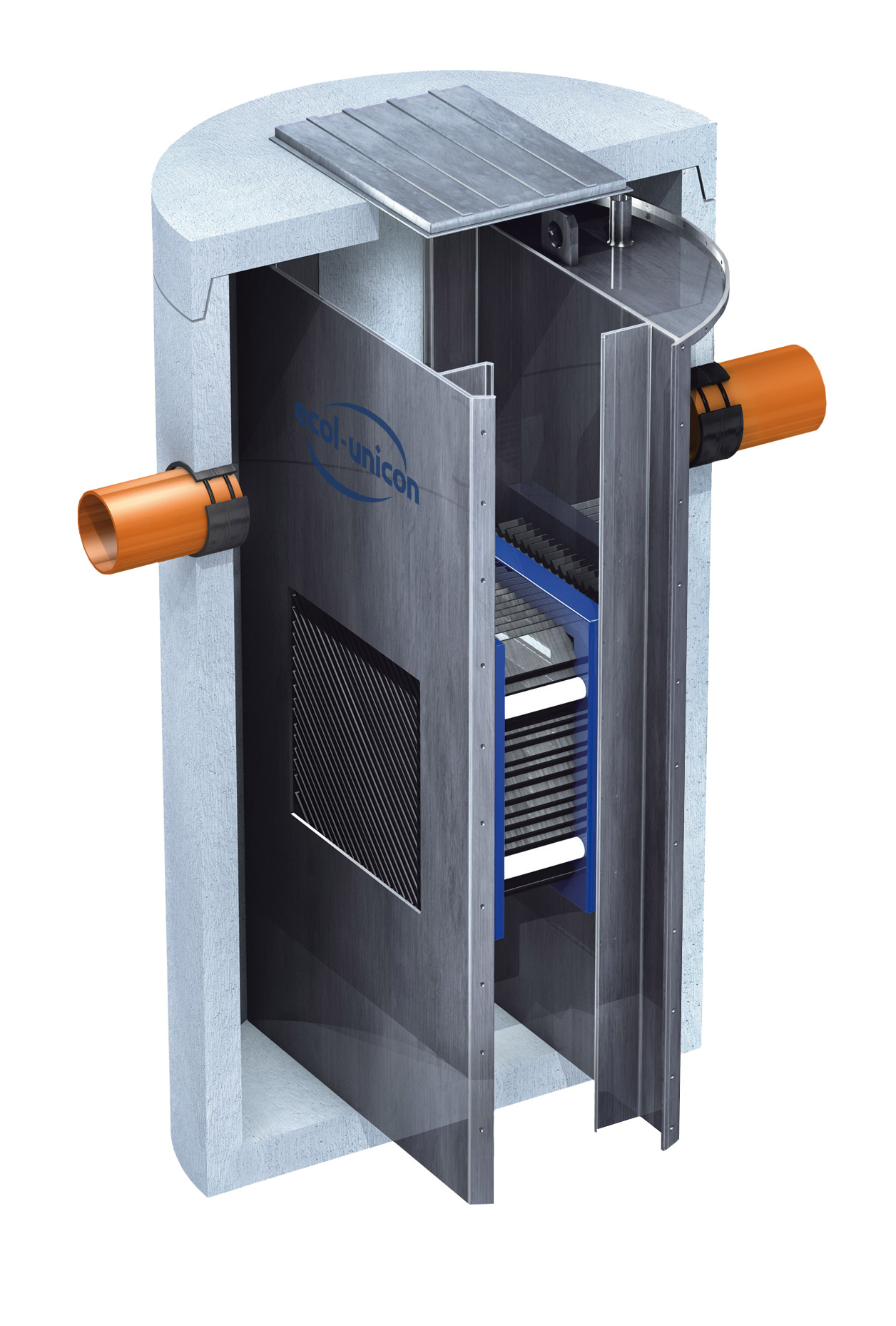 Separator lamelowe z osadnikiem ESL-ZH 3/30/300 Ecol-Unicon, (Qnom/Qmax/Vos*) - ESL-ZH 3/30/300, średnica rur wlot/wylot PVC-U pod kątem 180 stopni, H=2050 mm, separator bez włazu