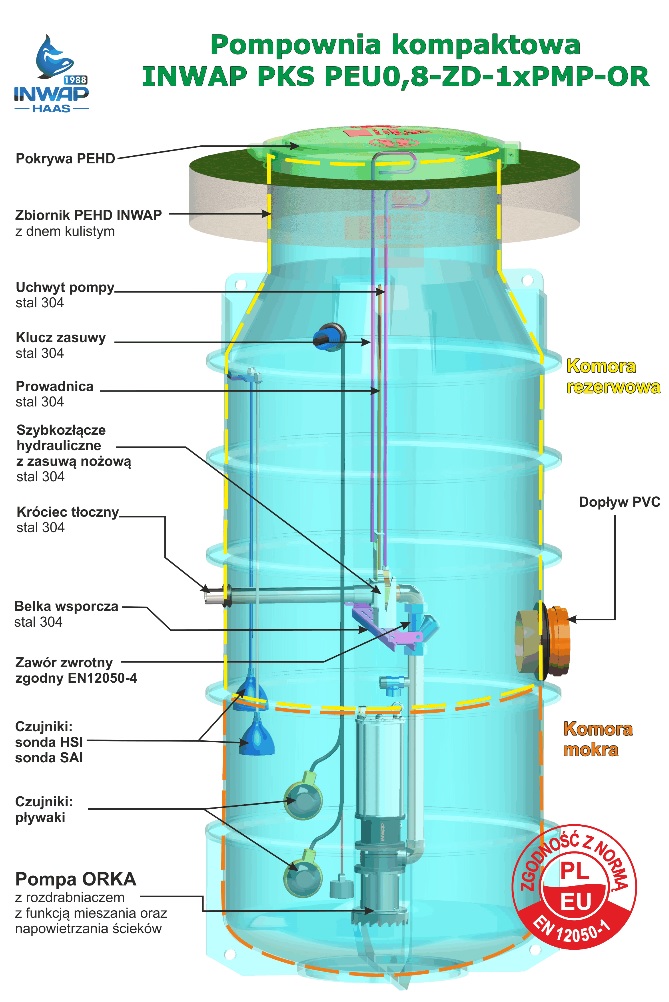 Przepompownia przydomowa INWAP PEU0,8-ZL-1xPMP-ORKT Qmax=1,6l/s,Hp=60m, P=1,5kW, przewód 10mb, skrzynka sterująca SZS-1xPMP-E13M