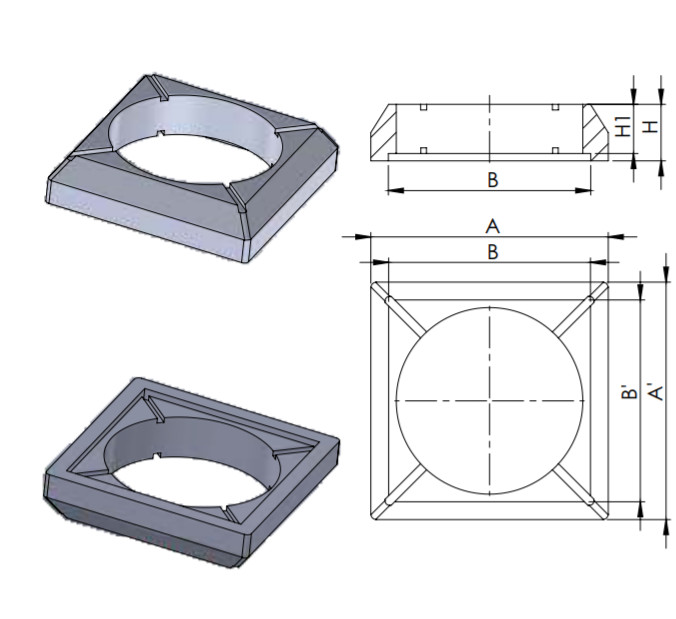 Uniwersalny adapter osłonowo-wspierający włazy teleskopowe DN315 klasy B125 i D400. Adapter ustawiany jest bezpośrednio pod korpusem włazu żeliwnego i posadowiony w konstrukcji drogi. W nawierzchniach bitumicznych strona skośna jest stroną wspierającą właz, natomiast w nawierzchni brukowej właz jest osadzony w zagłębieniu osłonowym adaptera - stona kwadratowa. Adapter osadzony jest na podbudowie cementowej w nawierzchni brukowej. W nawierzchni bitumicznej wymagane jest wykonanie poprawnego wypełnienia oraz zagęszczenia warstwy bitumicznej pod adapterem.