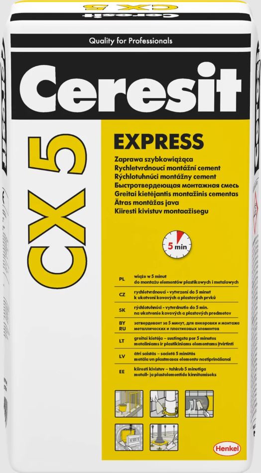 Ceresit CX 5 EXPRESS, 25 kg, zaprawa szybkowiążąca, czas wiązania 5min, do tamowania sączeń wody, do kotwienia, napraw małych ubytków i montażu elementów stalowych i plastikowych w betonie