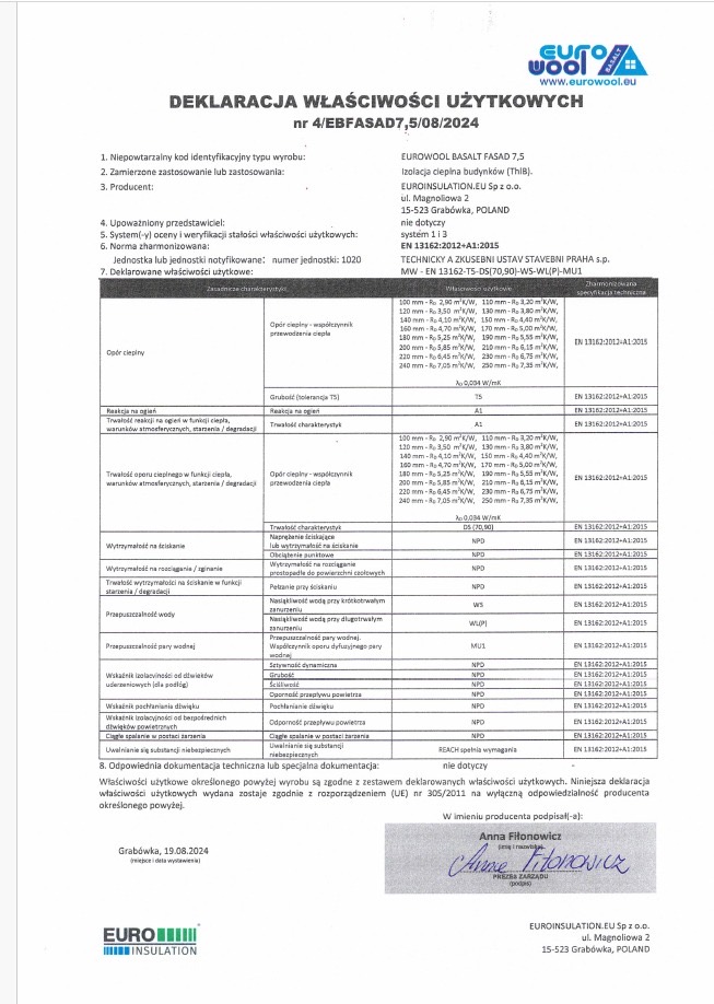 Wełna fasadowa 5 cm EUROWOOL BASALT; 0,034 W/mK; 1000x600 mm; 3,6 m2/pacz.; 115,2 m2/pal.