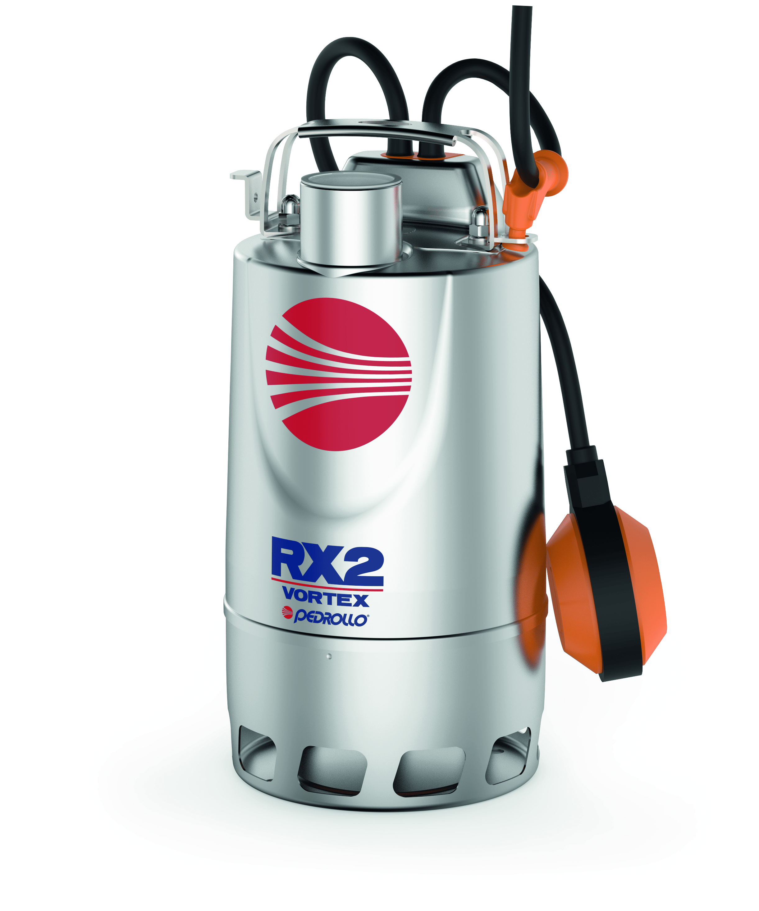 Pompa Pedrollo RXm 2/20; ścieki oczyszczone. Wirnik otwarty VORTEX, H=7,5-2 m, Q=0,3-3,1 dm3/s, 0,37 kW, 230V, wyjście 1 1/4”, rozmiar cząstek stałych 20 mm, kabel zasilający 5 m, włącznik pływakowy, ścieki do 60 °C lub do 90 °C przez 3 minuty.