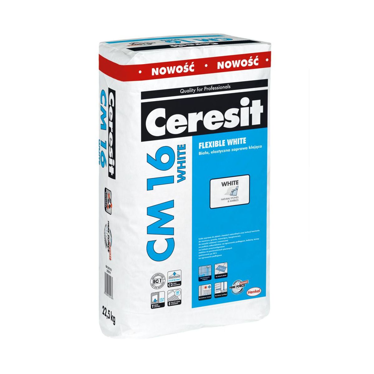 Ceresit CM 16 White, 22,5 kg, biały, grubowarstwowy, wysokoelastyczny klej do płytek wzmocniony włóknami Fibre Force