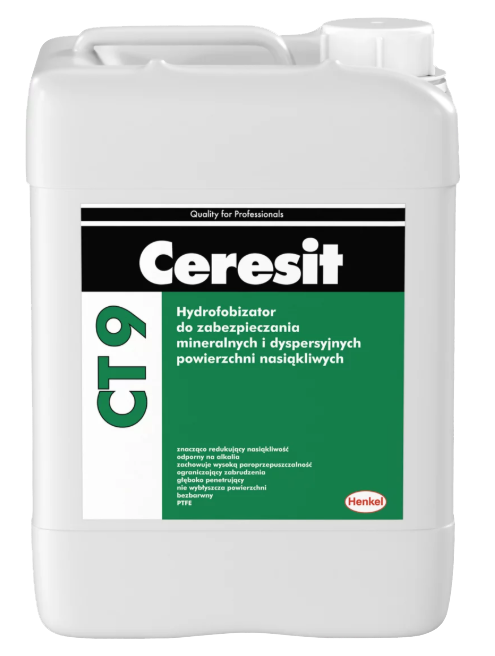 Ceresit CT 9, 10 l, hydrofobowy, bezrozpuszczalnikowy preparat do impregnacji podłoży mineralnych i dyspersyjnych, służy do zabezpieczania powierzchni nasiąkliwych, ogranicza zabrudzenia