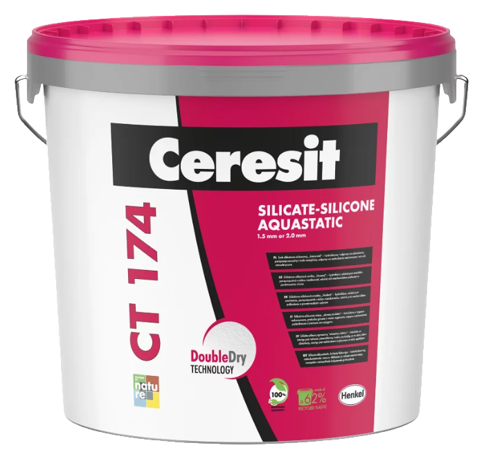 Ceresit CT 174 DOUBLE DRY baza do kolorowania (ziarno 2,0 mm), 25 kg, tynk silikatowo-silikonowy, cienkowarstwowy, o fakturze „kamyczek” ziarno 1,5 mm i 2,0 mm, dostępny w pełnej palecie barw Ceresit Colours of Nature®