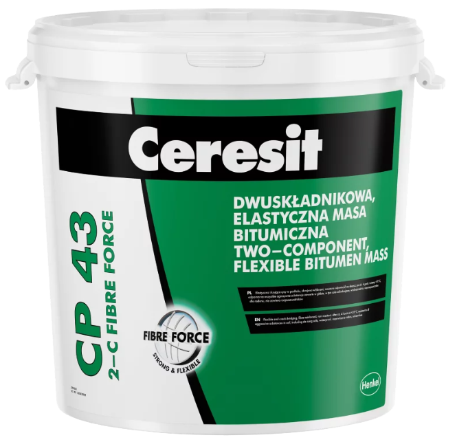 Ceresit CP 43, 28, dwuskładnikowa, grubowarstwowa, bitumiczno-kauczukowa masa uszczelniająca do robót izolacyjnych, elastyczna i kryjąca rysy w podłożu, do aplikacji ręcznej i maszynowej